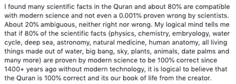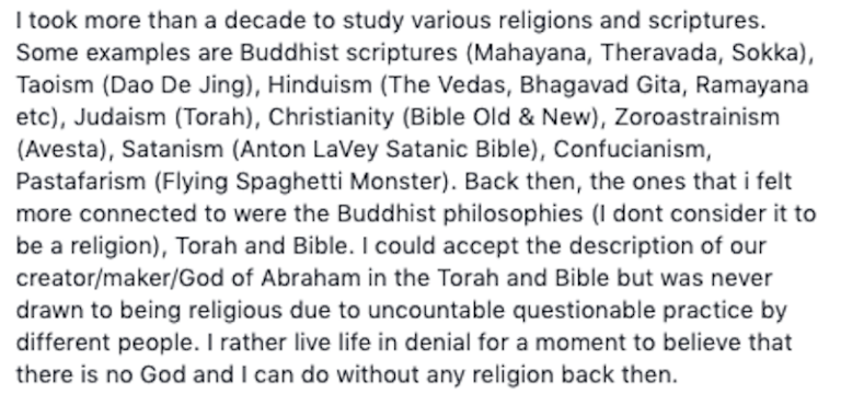 Menurut lelaki berasal dari Singapura itu, dia mengambil masa lebih 10 tahun bagi mengkaji dan mempelajari pelbagai agama dan kitab suci namun tidak dapat menerima amalan yang disusun serta dipraktikkan.