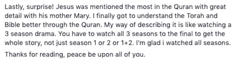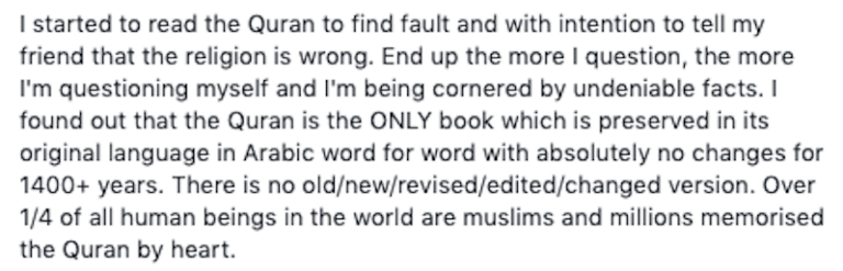 Mahu dijadikan cerita, dia menyedari bahawa belum membuka dan membaca al-Quran sepanjang proses ‘pencarian’ itu ketika berbincang tentang keagamaan dengan salah seorang rakan Muslimnya.