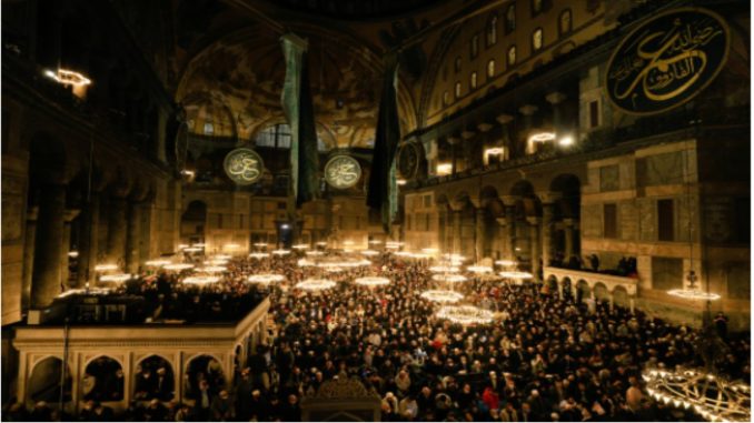ISTANBUL – Buat kali pertama dalam tempoh 88 tahun, Masjid Besar Hagia Sophia di Istanbul, Turki mengadakan solat terawih semalam.
