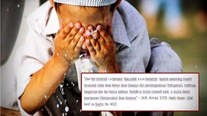 “Dari Abi Umamah r.a berkata: Rasulullah s.a.w bersabda: Apabila seseorang muslim berwuduk maka akan keluar dosa-dosanya dari pendengarannya (telinganya), matanya, tangannya dan dari kedua kakinya. Apabila ia duduk menanti solat, ia duduk dalam keampunan (diampunkan) dosa-dosanya”. – (H/R. Ahmad, 5/252. Hadis Hasan: Lihat Jami’ as-Saghir, No. 461)