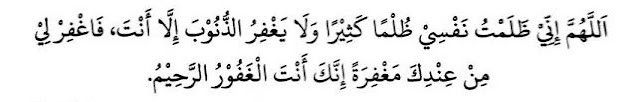 Maksudnya: Ya Allah, sesungguhnya aku telah menza limi diriku sendiri dengan keza liman yang besar. Dan tiada siapa yang akan mengampuni d0sa-d0saku melainkan Engkau. Maka ampunilah aku dengan keampunan yang besar daripada sisiMu. Sesungguhnya Engkau Maha Pengampun lagi Maha Pengasih.