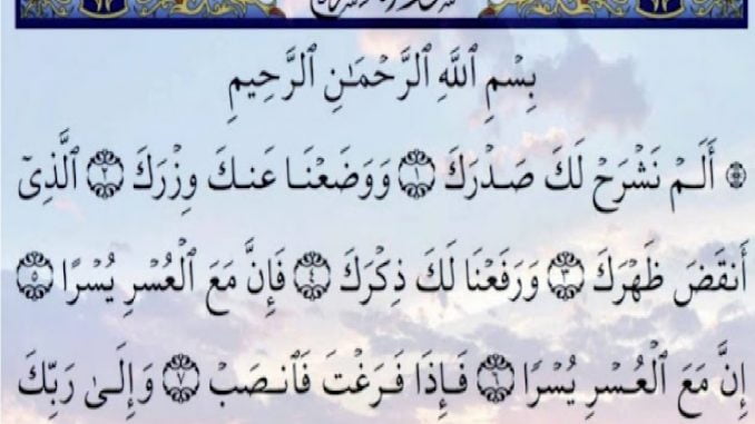 أَلَمْ نَشْرَحْ لَكَ صَدْرَكَ () وَوَضَعْنَا عَنْكَ وِزْرَكَ () الَّذِي أَنْقَضَ ظَهْرَكَ () وَرَفَعْنَا لَكَ ذِكْرَكَ () فَإِنَّ مَعَ الْعُسْرِ يُسْرًا () إِنَّ مَعَ الْعُسْرِ يُسْرًا () فَإِذَا فَرَغْتَ