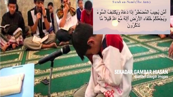“Atau siapakah yang memperkenankan (doa) orang yang dalam kesulitan apabila ia berdoa kepada-Nya dan yang menghilangkan kesusahan dan yang menjadikan kamu (manusia) sebagai khalifah di bumi? Apakah selain Allah ada tuhan (yang lain)? Amat sedikitlah kamu mengingati (Nya). ”