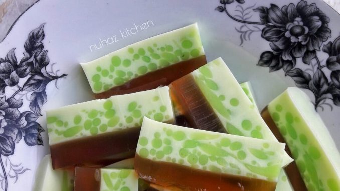 1. Lapisan gula merah; Masak bahan lapisan gula merah sehingga agar-agar larut. Kemudian tapiskan ke dalam bekas. Bila dah separuh beku cucukkan dengan garfu. Cucuk banyak tempat.