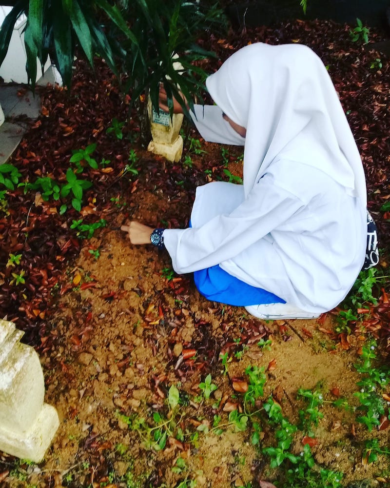 Ayah mimie datang ni melawat ayah, mimie dah janjikan mimie nak datang harini. Mimie balik dari kelas mimie terus datang jumpa ayah. Ayah biar laa air hujan membasihi diri mimie , biarlah mimie kotorkan baju sekolah mimie dengan tanah kbr ayah janji mimie dapat luahkan segala perasaan yang ada dalam diri ini…