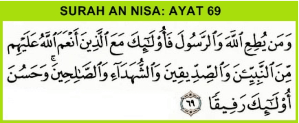 Dan sesiapa yang taat kepada Allah dan RasulNya, maka mereka akan (ditempatkan di Syurga) bersama-sama orang-orang yang telah dikurniakan nikmat oleh Allah kepada mereka, iaitu Nabi-nabi dan orang-orang Siddiqiin dan orang-orang yang Syahid, serta orang-orang yang soleh dan amatlah eloknya mereka itu menjadi teman rakan (kepada orang-orang yang taat).