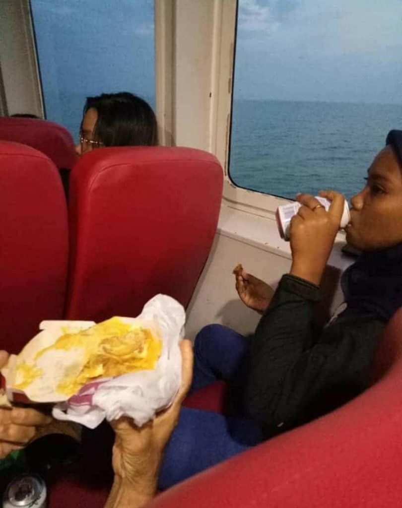 “Dari Langkawi ke Kuala Kedah. Tiba-tiba feri rosak dan terpaksa berpatah balik. Tukar feri semula dan tiada makanan untuk berbuka puasa.. Jadi berbuka dengan air saja. “Tiba-tiba ada makcik cina ni bagi coklat untuk berbuka.. Pastu dia buka semua coklat dia bagi kat semua Muslim yang puasa sebab dia cakap kena makan kalau berbuka,” tulisnya.