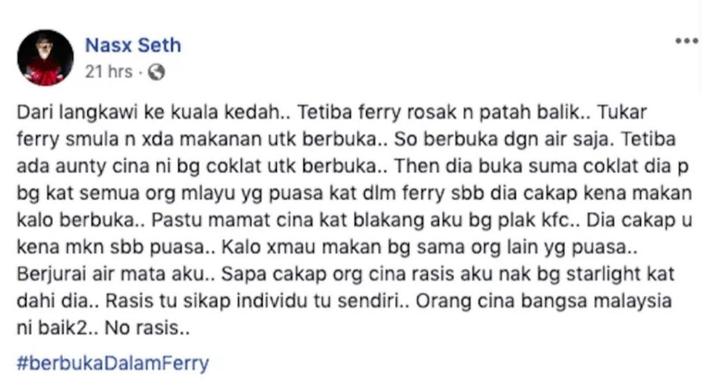 Terbaru, seorang pengguna laman Fa ce bo ok berkongsi cerita ketika berada di atas kapal feri yang mengalami kerosakkan dan malangnya, dia tiada makanan untuk berbuka puasa. Menurut Nasx Seth, dia terharu apabila terdapat dua individu prihatin menghulurkan makanan untuk mengisi perut yang kelaparan. Berbuka dalam feri!