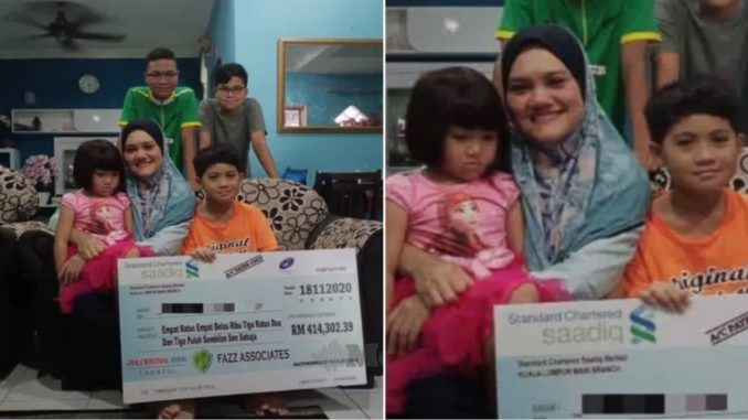 Katanya, dia bagaimanapun menerima kejutan semalam apabila dikunjungi wakil syarikat insurans bagi menyerahkan sejumlah wang RM414,302 dianggap ‘hadiah’ dari arwah suaminya yang sudah tiada.