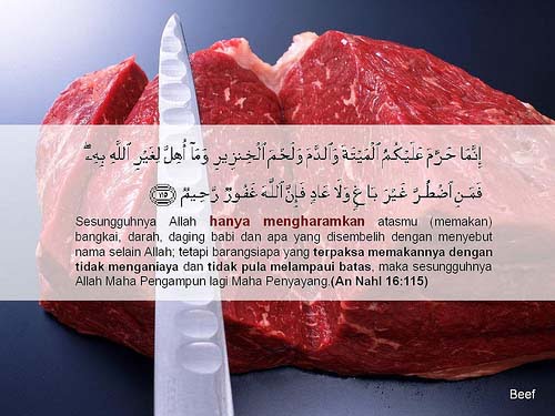 Firman Allah SWT maksudnya ,”Sesungguhnya Allah hanya mengharamkan atasmu bangkai, darah, daging khinzir , dan (haiwan) yang disembelih dengan (menyebut nama) selain Allah..”.