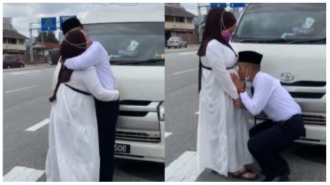 Di dalam video berkenaan turut kelihatan kedua-duanya saling berpelukan dengan erat untuk kali terąkhir. Lebih sebąk lagi apabila si suami kelihatan tidak henti mengusąp serta mengucup perut isterinya.