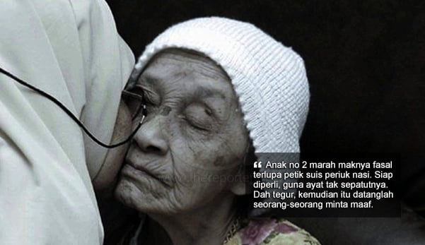 “Pakcik cakap lagi, masa kau orang kecil, duduk sekali dengan kami, mak tak pernah pun marah bila kau orang tanya banyak kali. Layan, jawab. Ada juga kamu terlupa nak ambil itu dan ini, mak kekal tak marah. Mak diamkan sahaja.