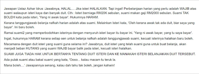 Saat seseorang bertanya kepada Syaikh ‘abdullah bin ‘Abdur Rahman al-Jibrin tentang hukum suami yang mengambil uang milik istrinya untuk kemudian digabungkan dengan uangnya. Maka Syaikh al-Jibrin mengatakan bahwa tidak disangsikan lagi bahwa istri lebih berhak dengan mahar dan harta yang ia miliki, baik melalui usaha yang dilakukannya, warisan, hibah dan
