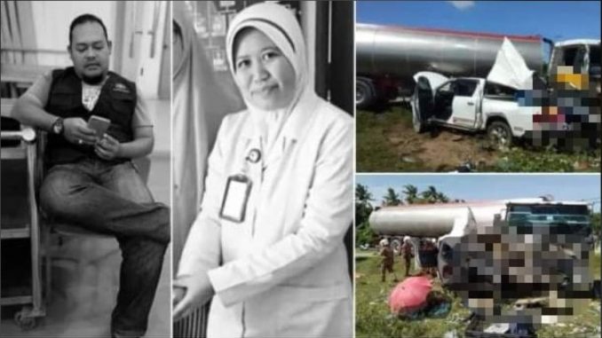 Pemandu Toyota Hilux, Mohd Zuhairi Abdullah, 35, dan jururawat, Julayha Kudus, 39, meninggal dunia di tempat kejadian kerana mengalami kecederaan parah.