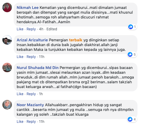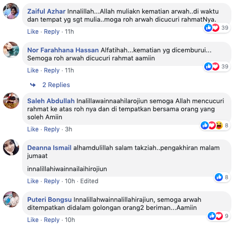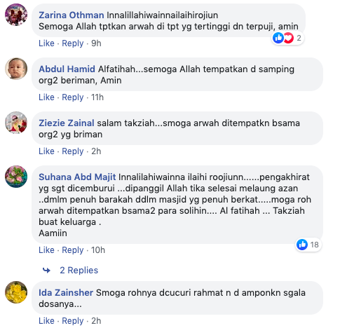 Sehubungan dengan perkongsian tersebut, rata-rata warganet telah menzahirkan ucapan takziah kepada keluarga jenazah atas pemergian seorang bilal yang merupakan kariah masjid An-Nur Felda Teloi Timur. Perjalanan menemui Allah S.W.T yang sungguh cantik aturannya telah dicemburui oleh mereka kerana menyifatkan kem4tian tersebut sebagai Khusnul Khotimah iaitu dijemput ilahi ketika sedang berbuat kebaikkan.