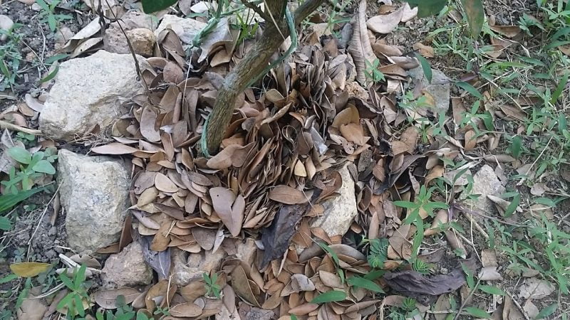 Hanya letak daun-daun kering atau daun rumput kering pada pangkal pokok.