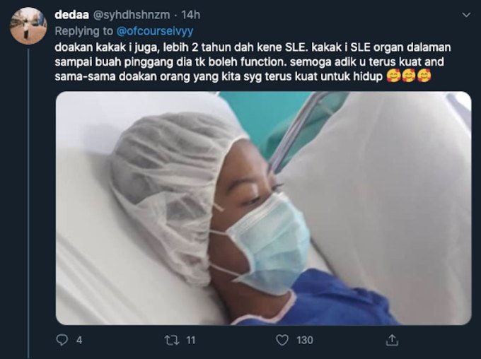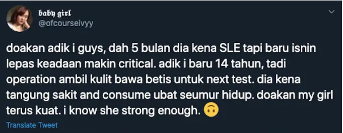 “Doakan adik i guys, dah lima bulan dia kena SLE tapi baru Isnin lepas keadaan makin kritikal. Tadi pembedahan ambil kulit bawa betis untuk ujian seterusnya,” tulisnya.