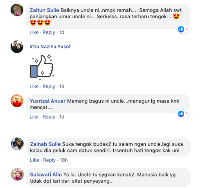 Ada juga netizen yang terharu melihat reaksi pada wajah ‘Uncle’ ketika menerima hadiah daripada kanak-kanak pasti.