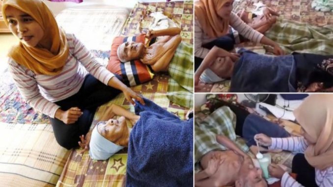 Katanya, anaknya yang sulung Aiman Haikal Aidi Fikri, 15, banyak membantu mendukung nenek dan datuknya untuk mandi setiap hari dan menyuap makanan.