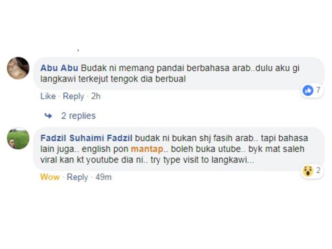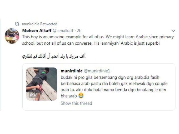 Baru-baru ini tular pautan video tentang seorang budak lelaki yang fasih berbahasa Arab di Langkawi. Video tersebut dirakam dan dikongsi oleh seorang pengguna Twitter, Munirdinie.