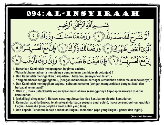 Oleh itu, maka (tetapkanlah kepercayaanmu) sesungguhnya tiap-tiap kesukaran disertai kemudahan Bahawa sesungguhnya tiap-tiap kesukaran disertai kemudahan Kemudian apabila engkau telah selesai (daripada sesuatu amal soleh) maka bersungguh-sungguhlah engkau berusaha (mengerjakan amal soleh yang lain) dan kepada Tuhanmu saja tempat engkau memohon. (apa yang engkau gemar dan ingini)