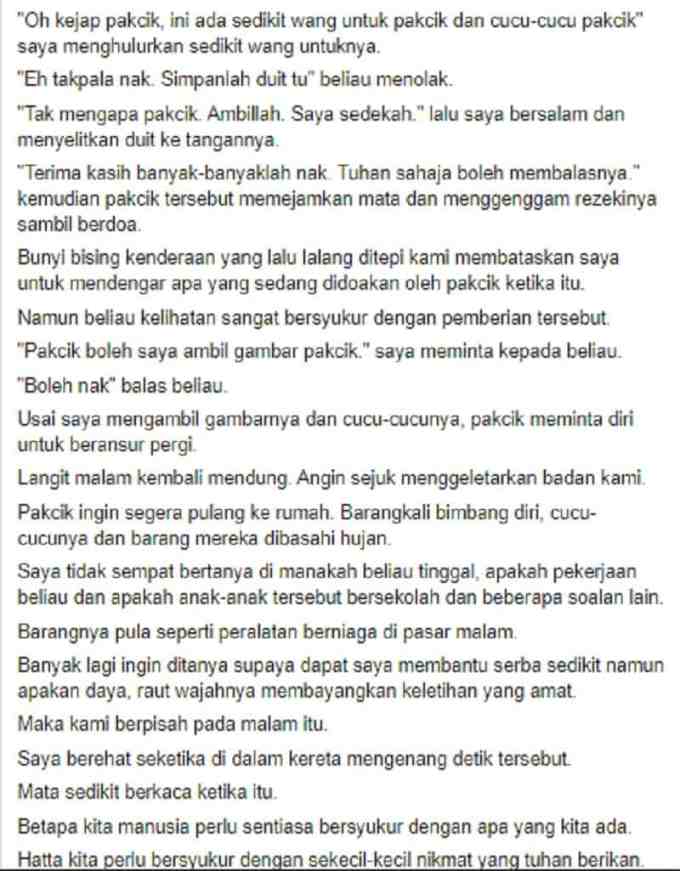 Tambah Dr Afiq, beliau menghulurkan sejumlah wang untuk warga emas dan cucunya dengan niat bersedekah malah warga emas tersebut kelihatan sangat bersyukur dengan pemberian itu.