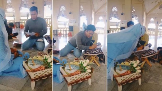 Namun hal ini berbeza dengan perkongsian yang dibuat satu akaun TlkT0k dikenali sebagai @hajid17 apabila pengantin lelaki hadir di majlis pernikahannya hanya memakai pakaian biasa iaitu seluar jeans dan T-Shirts sewaktu melafazkan akad nikah.