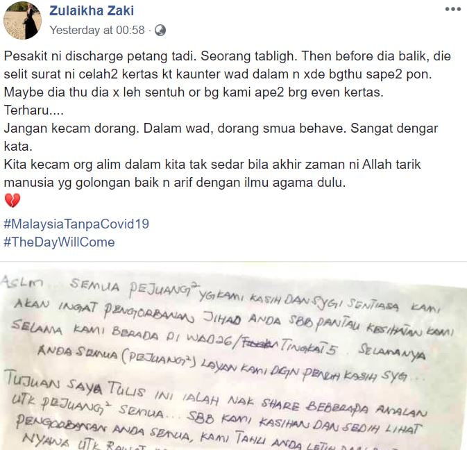 Demikian perkongsian seorang petugas barisan hadapan (frontliners) yang kini bertungkus lumus merawat pesak1t COVlD-l9 mendedahkan surat yang diberikan oleh salah seorang jemaah tabIigh.